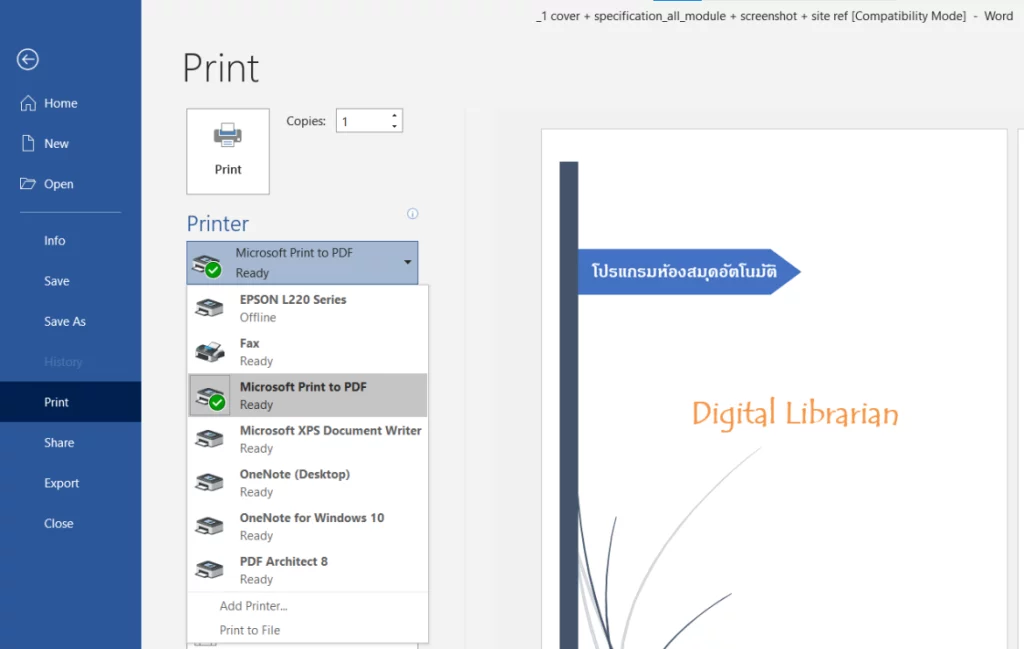 ตอนก่อนหน้านี้ เมื่อประมาณ 7 ปีที่แล้ว กล่าวถึงการทำ pdf ไฟล์ ที่ต้องใช้ โปรแกรมเสริมอย่าง Acrobat Distriller หรือ Cutepdf writer หรืออื่นๆ แต่ปัจจุบัน เราสามารถแปลงไฟล์เป็น .pdf ได้โดยตรง จากโปรแกรม Microsoft word หรือโปรแกรมอื่นๆ ในตระกูล Microsoft เช่น Excel โดยเมื่อทำเนื้อหาเสร็จแล้ว ก็เพียงสั่ง พิมพ์ (Print) และเลือกเครื่องพิมพ์ (Printer) เป็น Microsoft Print to PDF จากนั้นตั้งชื่อไฟล์ เลือกที่เก็บ เท่านี้ก็เป็นอันเสร็จสิ้น